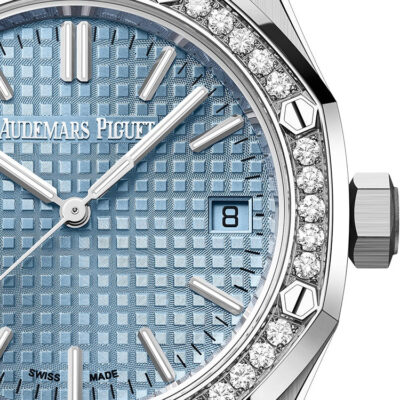 Unworn Audemars Piguet Royal Oak SELFWINDING “50TH ANNIVERSARY” 15551ST.ZZ.1356ST.01. 37 mm, Light blue dial with “Grande Tapisserie” pattern, white gold applied hour-markers and Royal Oak hands with luminescent coating, Stainless steel case, bezel set with brilliant-cut diamonds, glareproofed sapphire crystal and caseback, 5900 calibre, Selfwinding movement, 60 h power reserve, 29 jewels, Stainless steel bracelet AP folding clasp. Water resistant to 50 m.