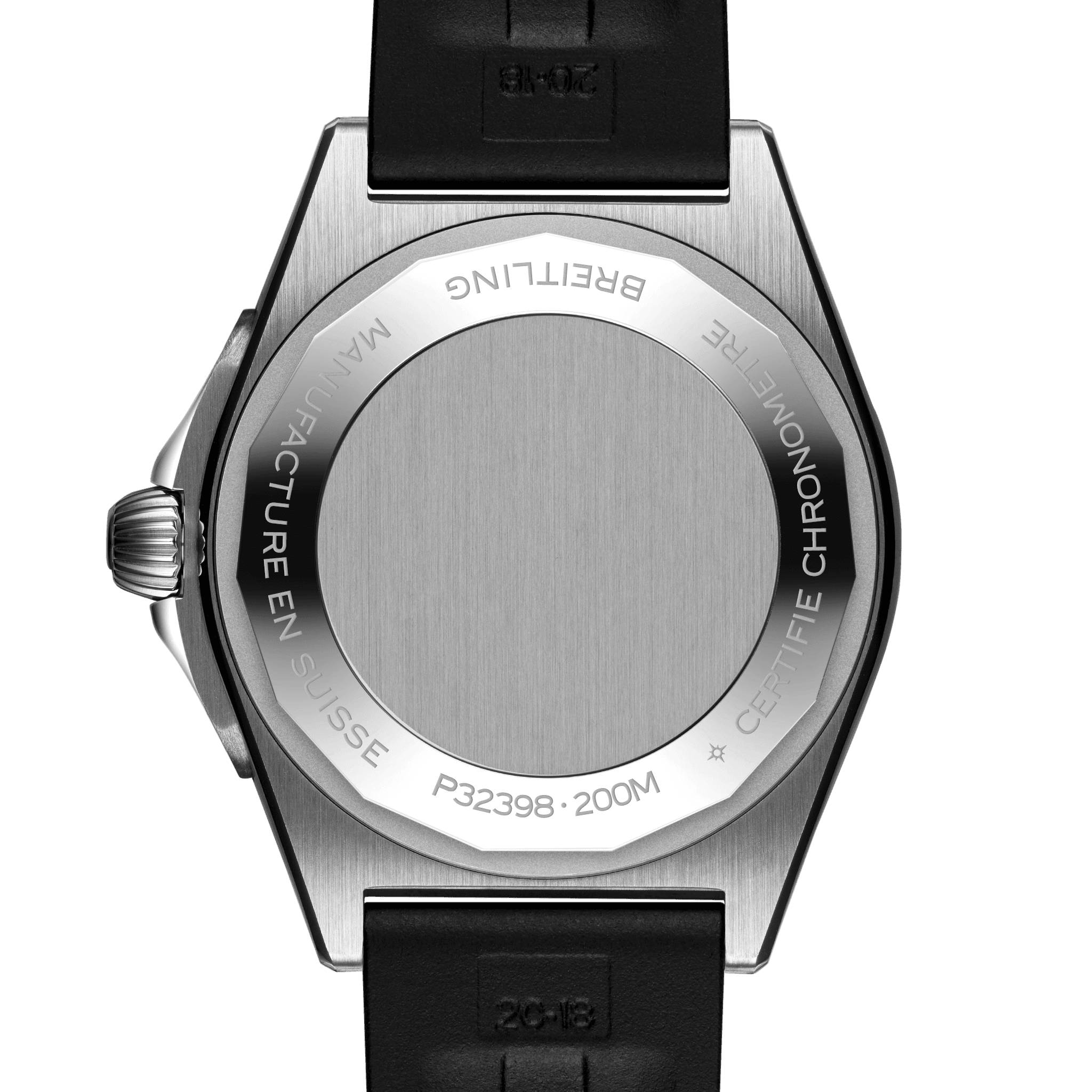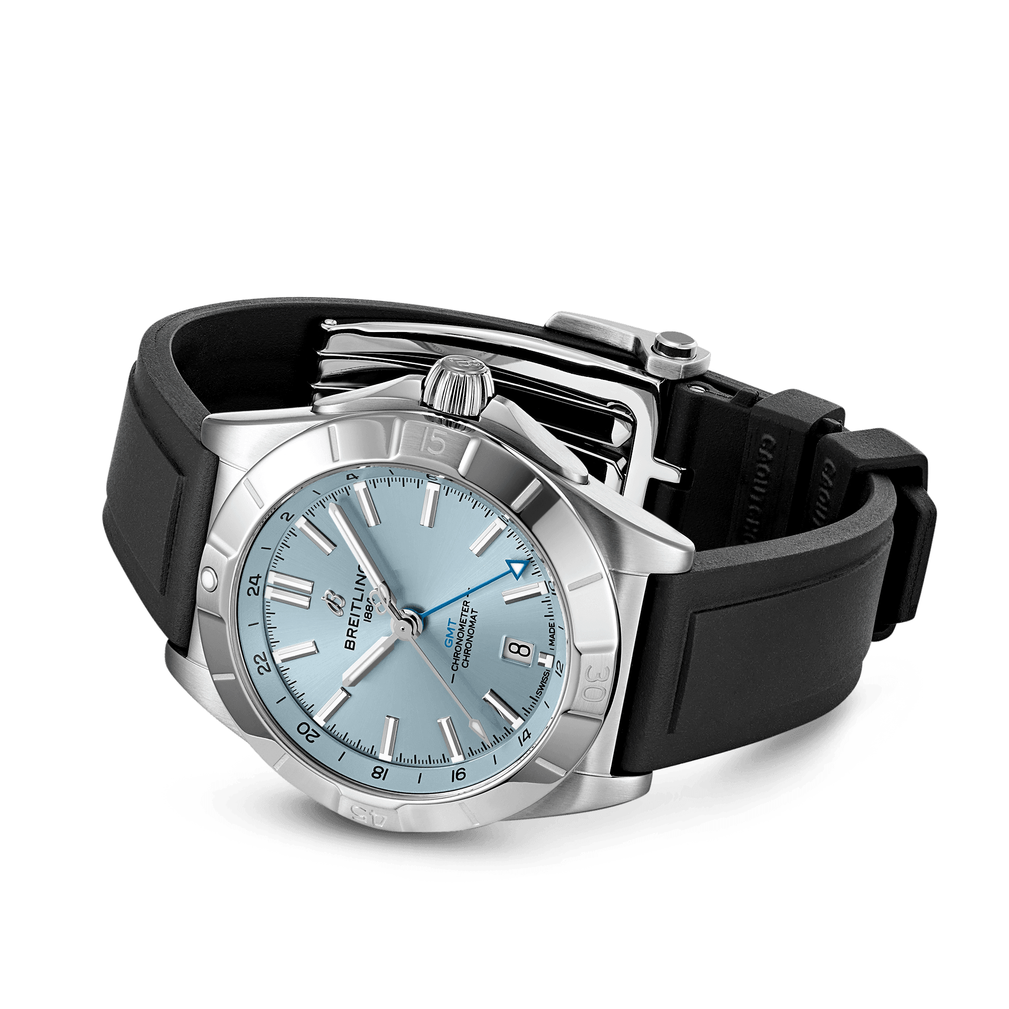 Unworn Watch Breitling Chronomat B01 40, brushed and polished finished Stainless steel and Platinum case, Reference P32398101C1S1. This model has Ice blue dial and dial flange. Applied polished index hour markers with luminous fill. The silver-tone polished minute and hour hands with luminous filled tops. Fine printed minute/seconds and fractions of a seconds track. The watch has polished Stainless steel non-screw-locked crown with two gaskets with ribbed edge for a comfortable grip also Breitling logo and round chronograph pushers. The dial closed by a Cambered Scratch-resistant Sapphire Crystal with glare-proofed both sides. The watch mechanism is sewn up by a solid case back. Date window at 6 o’clock. GMT/2nd Time Zone Function: The central blue hand indicates GMT/Dual Time zone with the luminous arrowhead tip pointing to the 24 hour indications on the dial flange; The GMT hour hand makes a single revolution once in 24 hours. The watch is equipped Unidirectional, ratcheted polished Platinum bezel with brushed finished 1/4 hour rider tabs. The watch is Breitling in-house caliber 32, contains 21 jewels and has an approximate power reserve of 42 hours. The watch presented on a black Rubber strap with Stainless Steel Folding clasp. The water resistance is up to 200m/660ft.