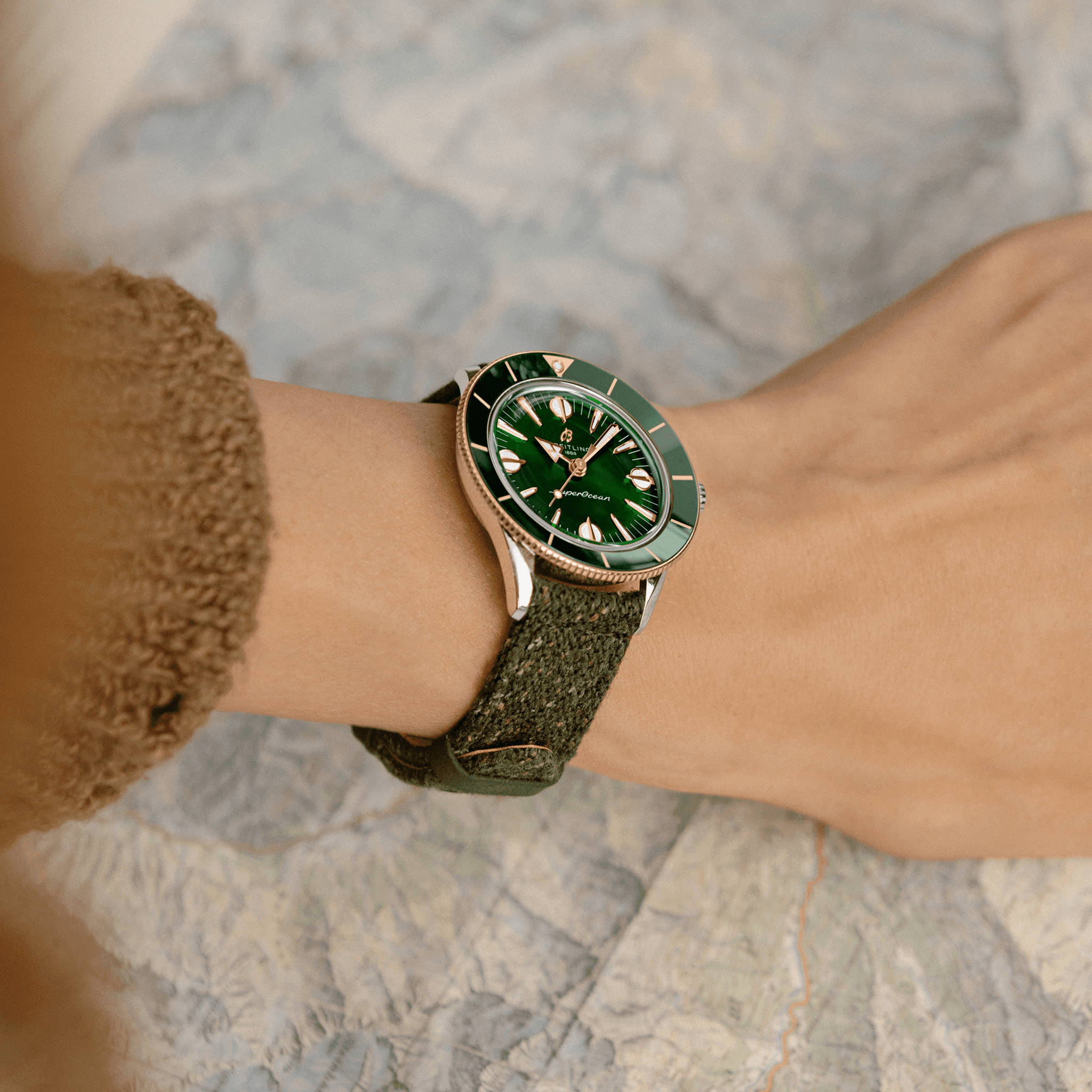 Unworn Breitling watch Superocean Heritage ’57 Highlands, Stainless steel and 18k Red Gold, case 38mm, Reference U10340361L1A1 a timeless tribute to the spirit of adventure and the golden age of diving. Inspired by the iconic design of the original 1957 Superocean, this modern interpretation combines vintage aesthetics with modern craftsmanship, making it a must-have for enthusiasts and collectors. Crafted with precision and attention to detail, the watch features a Green dial with a fine sunray finish that features an 18k Red Gold “B” emblem at 12 o’clock. Thanks to its classic design, the dial exudes a sense of maritime heritage. The distinctive retro-style hands, constructed from 18k Red Gold with luminescent fill, blend harmoniously with the elongated indexes for optimal legibility in low light conditions. The manufacturer paid special attention to the hour markers, making them from 18k Red Gold in the form of arrows with luminous filling. At the 3, 6, 9 and 12 o’clock positions, they are placed in the center of a luminous circle, emphasizing the vintage aesthetics. The dial closed by a Cambered Scratch-resistant Sapphire Crystal with glare-proofed both sides and solid Stainless steel case back. The watch has a screw-locked screwing down crown of polished Stainless steel with two spacers. Its ribbed edge provides a comfortable grip. The Breitling logo is applied to the end of the crown. The bi-directional 18k Rose Gold ratcheting bezel features a ribbed edge and features a polished Green ceramic ring with a luminous starting point set in a large 18к Red Gold triangle. The Model comes with Breitling Caliber 10 contains 25 Jewels and has an approximate power reserve of 42 hours. The watch presented on a Stainless steel Mesh bracelet, which is fastened Stainless steel Folding clasp. The complementary fabric strap is provided in a separate pouch. The water resistance is up to 100m/330ft.