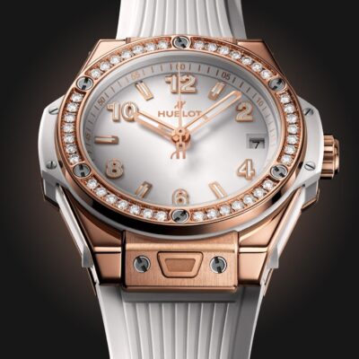 Unworn Hublot Big Bang ONE CLICK KING GOLD WHITE DIAMONDS 465.OE.2080.RW.1204. 39 mm, Matte White dial, Polished and Satin-finished 18K King Gold case, Sapphire with Anti-reflective Treatment crystal, Polished 18K King Gold Set with 42 Diamonds totaling 1.00ct with 6 H-shaped Titanium Screws bezel, HUB1710 calibre, Self-winding Movement, 50hours power reserve, White Structured Lined Rubber Straps with 18K King Gold and Gold-plated Titanium Deployant Buckle Clasp. Water resistant to 100 m.