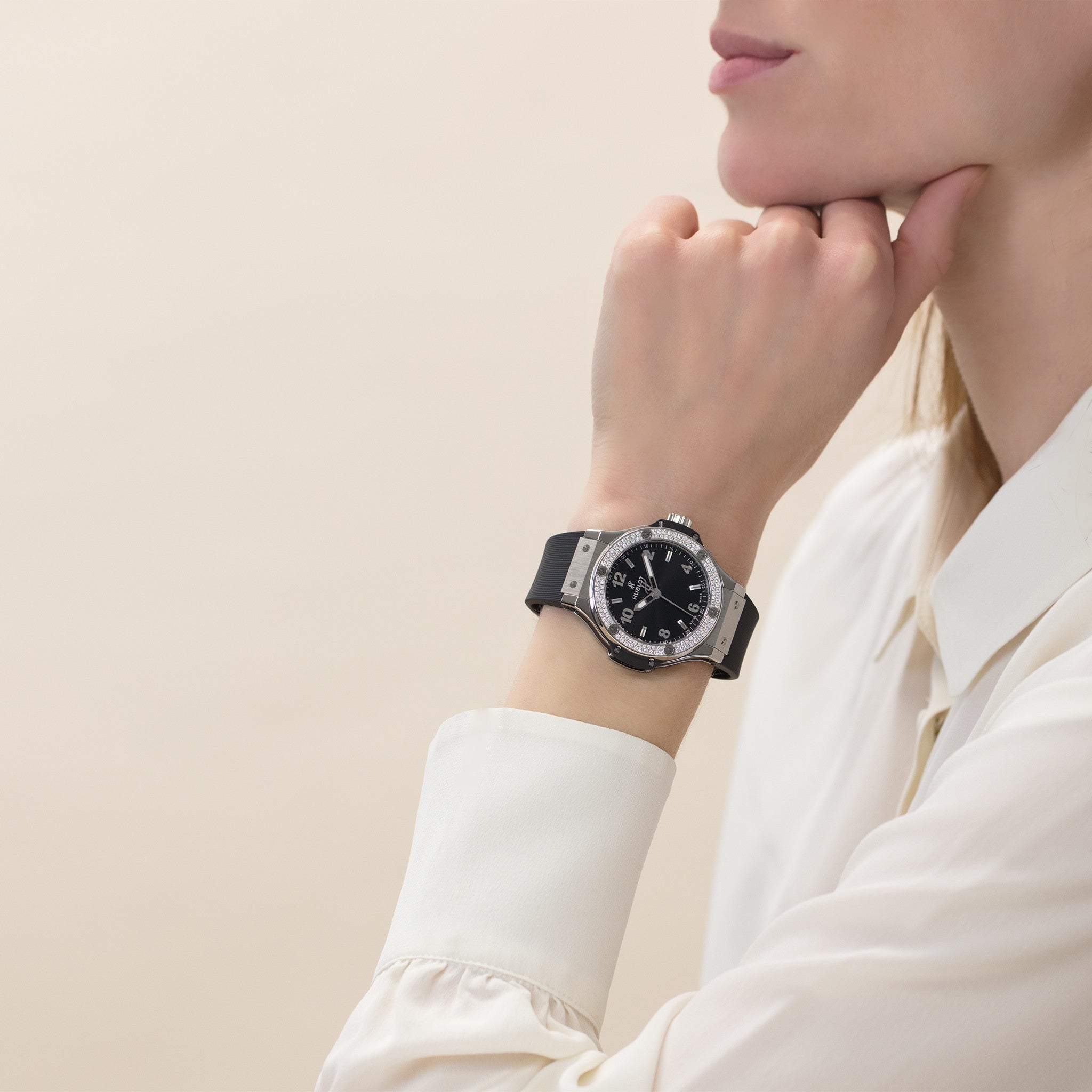 Hublot Big Bang, Steel, Black Diamonds, 38mm watch, Stainless Steel case with brushed and polished finishes, Reference 361.SX.1270.RX.1104. Case center (edge) lateral black composite resin inserts. This model has Solid black metallic dial with a fine sunburst texture. Applied brushed finished stainless steel “applique” style alternating Arabic Numerals and Index hour markers. Brushed finished stainless steel hands with luminous filled tips (minutes and hours hands semi-skeleton). Printed minute track with 5-minute Arabic numerals intervals on the outer perimeter of the dial. Stainless steel Push / pull crown has a black rubber center/insert with the Hublot logo. The dial closed by a Scratch-resistant Sapphire Crystal with Anti-reflective Treatment. The watch is equipped fixed Stainless steel bezel set with 126 diamonds weighing +/- 0.87 carats with immediately recognizable “H” style screws. The watch is Hublot quartz/battery powered Caliber HUB 2900, contains 7 Jewels and has an approximate power reserve of 3-5 years. This model presented on a Black Lined Rubber Strap with Stainless Steel Deployant Buckle Clasp. The water resistance is up to 100m/330ft (10 ATM).