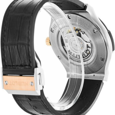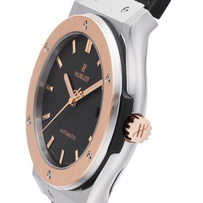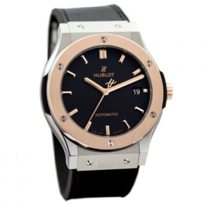 Hublot Classic Fusion Automatic 45mm watch, Satin-finished and polished titanium case with brushed finished top and bottom center links between the lugs, Reference 511.NO.1181.LR. This model has flat matte black dial with 18kt Rose Gold polished hands and brushed finished 18k Rose Gold “applique” style index hour markers. Date window located the 3 o’clock positions. Solid polished 18k Rose Gold crown engraved with the Hublot logo. The dial closed by a Scratch-resistant Sapphire Crystal with Anti-reflective Treatment. Of Sapphire Crystal made transparent case back. The watch is equipped fixed solid Vertical Satin-finished 18K King Gold  bezel with brushed finished top and polished finished beveled edges, secured with 6 polished “H” style titanium screws. Black composite resin “bezel lug” sandwiched between the bezel and case. The watch is self-winding mechanical Hublot Caliber HUB1112, contains 25 Jewels and has an approximate power reserve of 42 hours. This model presented on a black rubber strap with a black stiched (alligator) leather top with Stainless Steel Deployant Buckle Clasp. The water resistance is up to 50m/150ft (5 ATM).