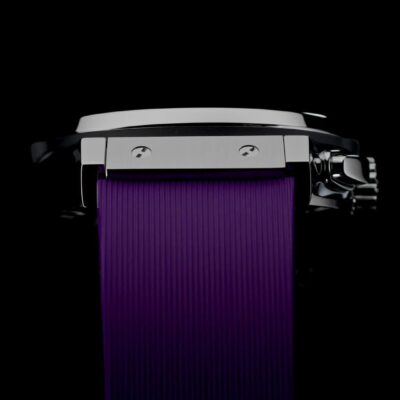 Paying tribute to the most popular Football League in the world, as its largest partner, Hublot created the Hublot Classic Fusion Chronograph Premier League men’s watch, 42 mm, reference 541.NX.8970.RX.PLW23 with the famous crowned Premier League lion at 3 o’clock.  This explosive model is rightfully a harmonious combination of classic and sporty style, creativity and traditional craftsmanship of the manufacturer, high strength and impeccable precision. This is a unique tribute to the king of the sport and the Premier League – one of the best football tournaments in the world. The watchcase is made of satin-brushed and polished titanium, renowned for its strength, lightness and scratch resistance. The bezel boss, located between the bezel and the case, is made of black composite resin.The elegant Matte Purple dial with polished rhodium-plated hands and applique-style applied index hour markers with a matte finish is instantly recognizable as Hublot. Thanks to the presence of a chronograph, which includes a large central seconds hand with the “H” logo as a counterweight and 30-minute counter located at 9 o’clock, this model can rightfully be called a high-end functional watch. The chronograph is adjusted using polished titanium pushers at the 2 and 4 o’clock positions. In addition, this model have small seconds dial located at the 3 o’clock position and a date indicator at the 6 o’clock position. Helping control the watch is a Pull / push crown engraved with the Hublot logo in Titanium with contoured grooves for improved grip. The dial closed by a Scratch-resistant Sapphire Crystal with Anti-reflective Treatment. The case back of the watch is also made of sapphire crystal, allowing you to observe the fantastic work of the watch movement. The traditional Hublot, but no less elegant Titanium bezel with a brushed top and polished beveled edge, secured with 6 immediately recognizable polished titanium screws in the shape of the letter “H”. The flawless operation of the watch is ensured by the HUB1153 Self-winding Chronograph Movement, which contains 35 jewels and has an approximate power reserve of 42 hours. This model is presented on an elegant and comfortable Purple lined rubber Strap with Stainless Steel Deployant Buckle Clasp. Water resistance is up to 50m/165ft (5 ATM).