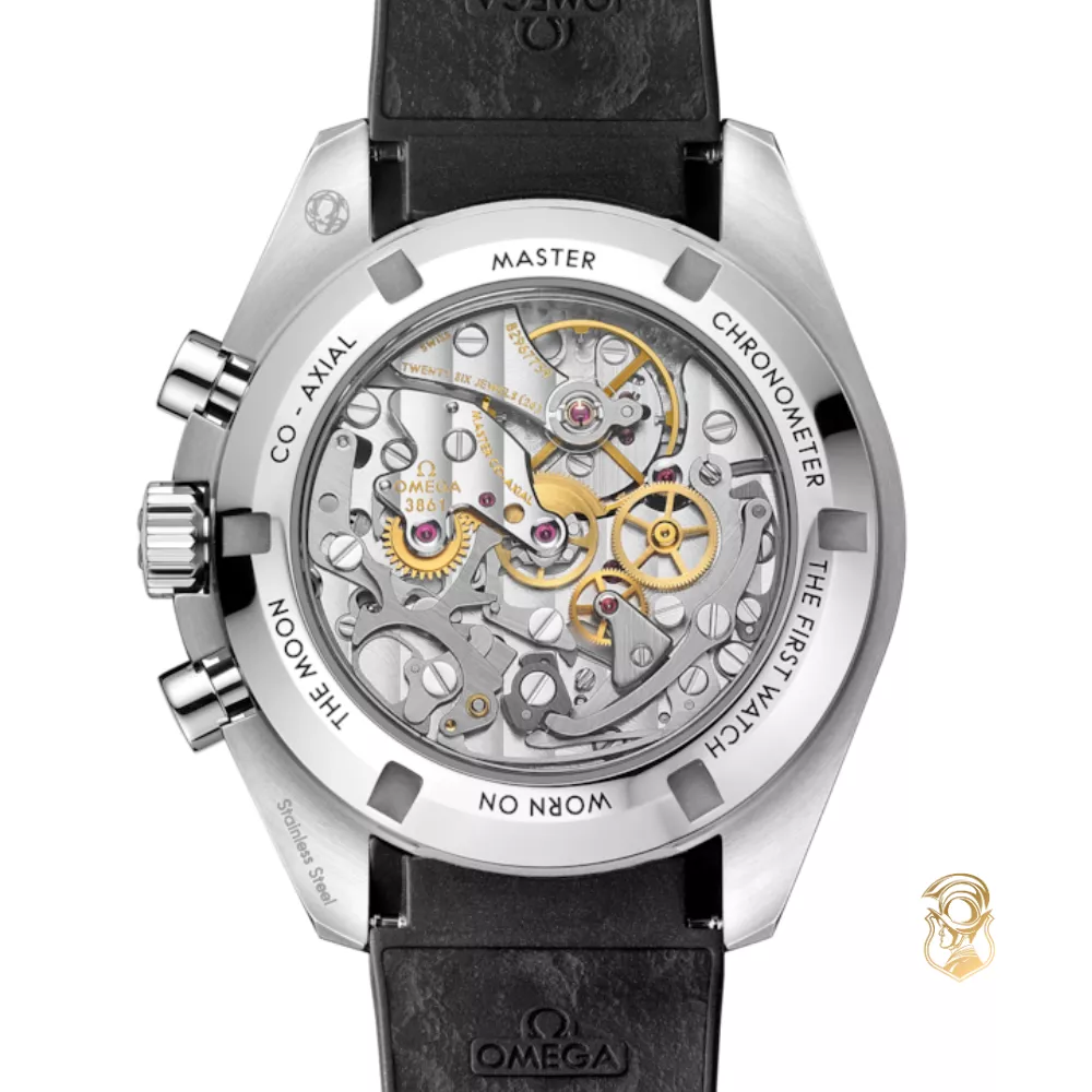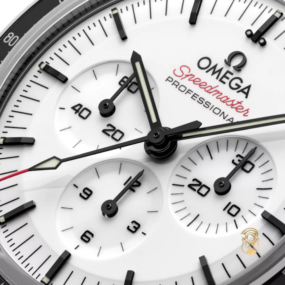 This 42 mm stainless steel Moonwatch features sapphire crystal on both the front and the caseback. Inspired by the 4th generation Speedmaster worn on the moon, it includes an asymmetrical case, a white lacquered step dial with the OMEGA logo and applied hour markers, classic Moonwatch-style hands, and the famous “Dot Over 90” on the black anodized aluminum bezel.