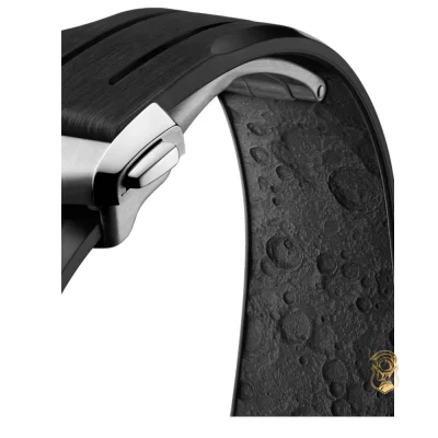 The watch is presented on an integrated black rubber strap with a distinctive lunar surface pattern on the underside.