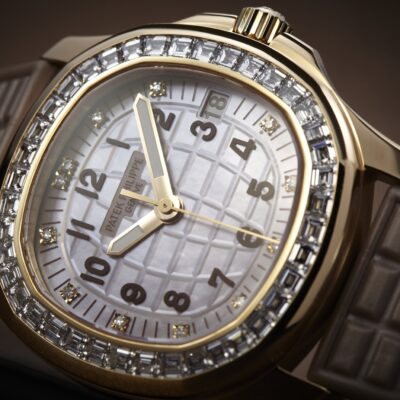 New Patek Philippe Aquanaut Luce Haute Joaillerie luxury watch, 35,6mm, 18k Rose Gold, Ref. 5072R-001. Reliable and modern, feminine and elegant, they perfectly match the character of the young and dynamic line of watches from the Aquanaut collection. The rounded octagonal 18k Rose Gold body and gently curved lugs, with polished flat surfaces and satin-finish sides are unmistakable. The mother-of-pearl dial with an engraved checkerboard pattern and a glamorous combination of soft beige and more intense beige is a real delight. It harmoniously looks perfectly legible overhead polished Arabic numerals from 18k Rose Gold, painted in brown, in the form of hour markers. The manufacturer paid special attention to the minute track on the outer rim of the dial, on which brown lines and 12 marks of diamond are applied, located every 5 minutes. Large polished luminous hour and minute hands in 18k Rose Gold indicate the time guarantee perfect readability even in the dark. These are complemented by a slim and elegant 18k Rose Gold second hand (Sweep seconds hand). The date indicator in the aperture is traditionally located at the 3 o’clock position. A polished 18k Rose Gold screw-down crown with a ribbed edge for a comfortable grip and the Patek Philippe logo is the finishing touch to the perfect picture. The dial is covered with a scratch-resistant sapphire crystal. A screw-down Sapphire Crystal case back, also made allows you to see the magical workings of the movement. The elegant highlight of this model is the fixed sparkling 18k Rose Gold bezel set with 40 baguette diamonds (~2.76ct) flawless. The polishing on the sides impresses with classic precision. It also looks amazing because at first glance, it looks rounded, but on closer inspection, you can see the crisp edges playing with the light. The model is equipped with a Patek Philippe Caliber 324 S C, with a self-winding mechanical movement containing 29 Jewels, with a power reserve of min. 35 hours – max. 45 hours. This beautiful sport chic watch is presented on a Pearly beige polymer strap that continues the visual harmony of the design made of Composite material. The strap are fastens with Patek Philippe’s patented polished 18k Rose Gold folding clasp and engraved with the Calatrava cross set with 10 baguette diamonds (~0.34 ct). Opening the clasp reveals the engraved Patek Philippe logo with the word GENEVE. Water resistant up to 120m/394ft (12 ATM).