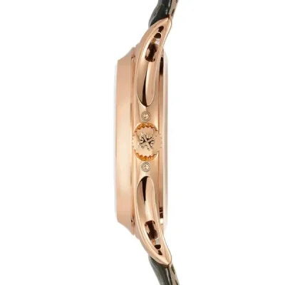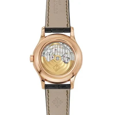 Patek Philippe Complications Automatic Mens Watch 5205R-010, 18 carat rose gold case with a black alligator leather strap. Fixed bezel. Black dial with rose gold-tone hands and index hour markers. Dial Type: Analog. Annual calendar. One- 24 hour (inner moonphase). Patek Philippe Calibre 324 S QA LU 24H/206 automatic movement with about 45 hours of power reserve. Scratch resistant sapphire crystal. Skeleton transparent exhibition see through case back. Case size: 40 mm. Round case shape. Buckle clasp. Water resistant at 30 meters / 100 feet. Functions: annual calendar, moon phase, month, date, day, GMT, second time zone, hour, minute, second.