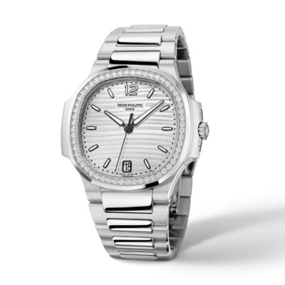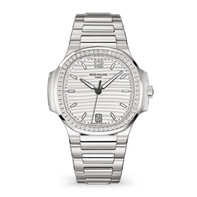 Ladies Watch Patek Philippe Nautilus Ladies Automatic Stainless Steel case with polished and satin finishes, 35,2mm, Reference 71181/200A-010 – has been the standard in luxury, because combine elegance, sporty style and timeless design. Is striking watch boasts a Silvery Opaline dial with gently undulating embossed decor dial, 18k White Gold applied hour markers and Arabic numeral at the 12 o’clock positioning with a luminescent coating for easy readability in dim lighting as well as Dot minute markers around the outer rim. The sweep seconds hand and date in an aperture features at the 6 o’clock positioning give this model a clean profile and make keeping track of both date and time convenient. Complementing the elegant dial are 18k White Gold polished luminous alpha-style shape hands. A polished Stainless Steel Screw-down crown with a ribbed edge for easy grip and the Patek Philippe logo is completes the watch’s harmony. The dial closed by a Scratch-resistant Sapphire Crystal. Sapphire-crystal too case back, which allows of the case, allows you to see the magical work of the movement. The wide rounded octagonal with polished and satin finishes bezel, in a Stainless Steel, provides a wide view of the dial, as the horizon is visible through the porthole. Moreover, side protrusions, also called “lugs”, are inspired by the hinges on these windows. In addition, 56 diamonds (~0.67 carats) decorating the bezel make it fantastic. The Model has caliber Patek Philippe Caliber 324 S C, with a self-winding mechanical movement containing 29 Jewels, with a power reserve of min. 35 hours – max. 45 hours. In addition, this beautiful sport-chic watch on presented on the Stainless Steel bracelet with polished and satin finishes and Stainless Steel Nautilus fold-over clasp. The water resistance is up to 60m/200ft (6 ATM).