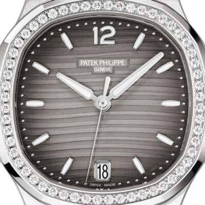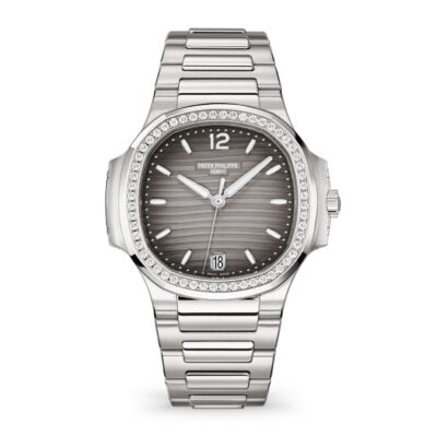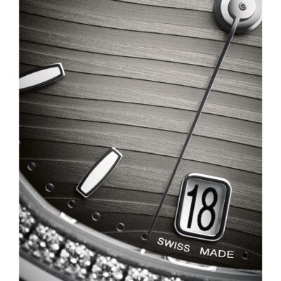 Ladies Watch Patek Philippe Nautilus Ladies Automatic Stainless Steel case with polished and satin finishes, 35,2mm, Reference 71181/200A-011 – has been the standard in luxury, because combine elegance, sporty style and timeless design. Is striking watch boasts a Gray Opaline dial with gently undulating embossed decor dial, 18k White Gold applied hour markers and Arabic numeral at the 12 o’clock positioning with a luminescent coating for easy readability in dim lighting as well as Dot minute markers around the outer rim. The sweep seconds hand and date in an aperture features at the 6 o’clock positioning give this model a clean profile and make keeping track of both date and time convenient. Complementing the elegant dial are 18k White Gold polished luminous alpha-style shape hands. A polished Stainless Steel Screw-down crown with a ribbed edge for easy grip and the Patek Philippe logo is completes the watch’s harmony. The dial closed by a Scratch-resistant Sapphire Crystal. Sapphire-crystal too case back, which allows of the case, allows you to see the magical work of the movement. The wide rounded octagonal with polished and satin finishes bezel, in a Stainless Steel, provides a wide view of the dial, as the horizon is visible through the porthole. Moreover, side protrusions, also called “lugs”, are inspired by the hinges on these windows. In addition, 56 diamonds (~0.67 carats) decorating the bezel make it fantastic. The Model has caliber Patek Philippe Caliber 324 S C, with a self-winding mechanical movement containing 29 Jewels, with a power reserve of min. 35 hours – max. 45 hours. In addition, this beautiful sport-chic watch on presented on the Stainless Steel bracelet with polished and satin finishes and Stainless Steel Nautilus fold-over clasp. The water resistance is up to 60m/200ft (6 ATM).
