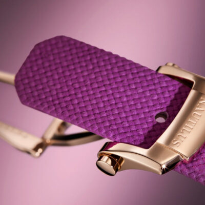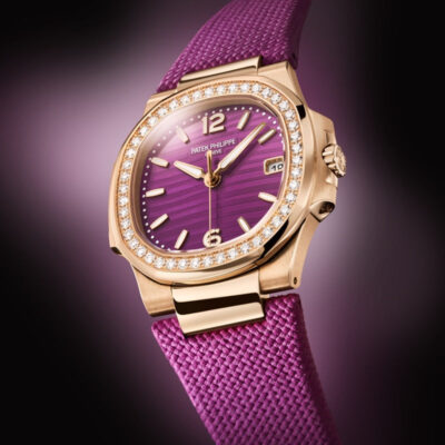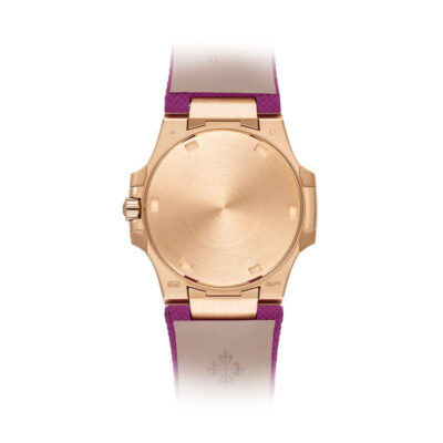 Introducing the Patek Philippe Nautilus 7010R-013, a luxurious and elegantly crafted timepiece that epitomizes sophistication. This exquisite 32mm watch is fashioned from 18k rose gold, reflecting the pinnacle of refined style. The dial, in a stunning lacquered purple, is both vibrant and subtle, set against the shimmer of rose gold applied hour markers and numerals. Each marker is enhanced with a luminescent coating for superior readability under varying lighting conditions. The date display at 3 o’clock is seamlessly integrated, maintaining the dial’s sleek and uncluttered appearance. The bezel is adorned with 46 sparkling diamonds, totaling approximately 0.73 ct, adding a brilliant touch of luxury and making the watch a true statement piece. These meticulously set gems not only elevate the watch’s allure but also showcase Patek Philippe’s commitment to exceptional craftsmanship. Driven by the quartz caliber E 23‑250 S C, this model promises precise and reliable timekeeping, ideal for daily wear. The sapphire-crystal case back provides a glimpse into the flawless engineering that powers the watch. The bracelet, Composite material with fabric pattern. It ensures a comfortable and secure fit with a fold-over clasp, designed for both safety and style.