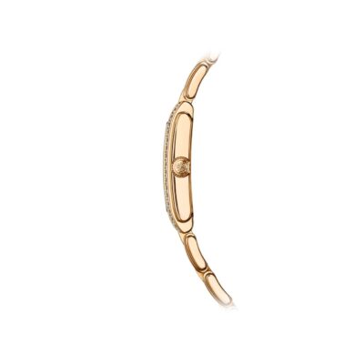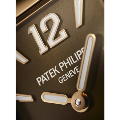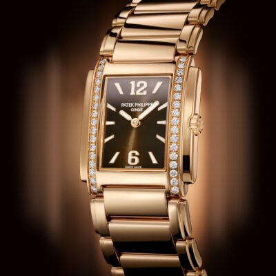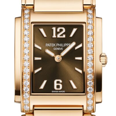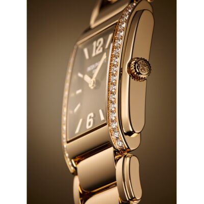 New Patek Philippe Twenty~4 Quartz Diamond Ladies luxury watch, 25.1 x 30 mm, 18k Rose Gold with 34 diamonds (~0.57 ct), Ref. 4910/1201R-001. This prestigious wristwatch is the epitome of timeless feminine elegance. The combination of classic and modern has made this watch the perfect companion for active professional women who want to stand out and express themselves. The sophisticated design of this stunning watch complements both business dresses and evening attire. The main attraction of the model is a Chocolate brown dial with sunburst decorated. Its beauty is emphasized large by 18k Rose Gold trapezoid-shaped markers and well-read even in the dark 18k Rose Gold Arabic numerals 6 and 12 with luminescent coating. Hands in the form of wands made of 18k Rose Gold with a luminescent coating also look luxurious. The polished 18k Rose Gold crown, the Patek Philippe logo the Calatrava Cross trademark, completes the perfect image. The dial is covered with a slightly curved scratch-resistant sapphire crystal, which emphasizes the curves of the case. The solid case back is made of 18k Rose Gold. The elegant highlight of the model is a slightly curved case with stunning flawless Wesselton diamonds arranged vertically along the case on a fixed 18k Rose Gold bezel, 17 on each side. The model is equipped with a Patek Philippe Quartz movement Caliber E 15 with silver oxide battery 1.55 V and a service life of 3 years. This fabulously beautiful timepiece is presented on a solid 18k Rose Gold bracelet with wide, gently curved central links framed by narrow double-tiered links. The link steps follow the steps of the lugs, giving the watch a more barrel-shaped silhouette. The same applies to the module between the lugs, which follows the shape of the central link. It fastens with a Patek Philippe patented folding clasp in polished 18k Rose Gold engraved and the Calatrava cross. Water resistant up to 30m/99ft (3 ATM).