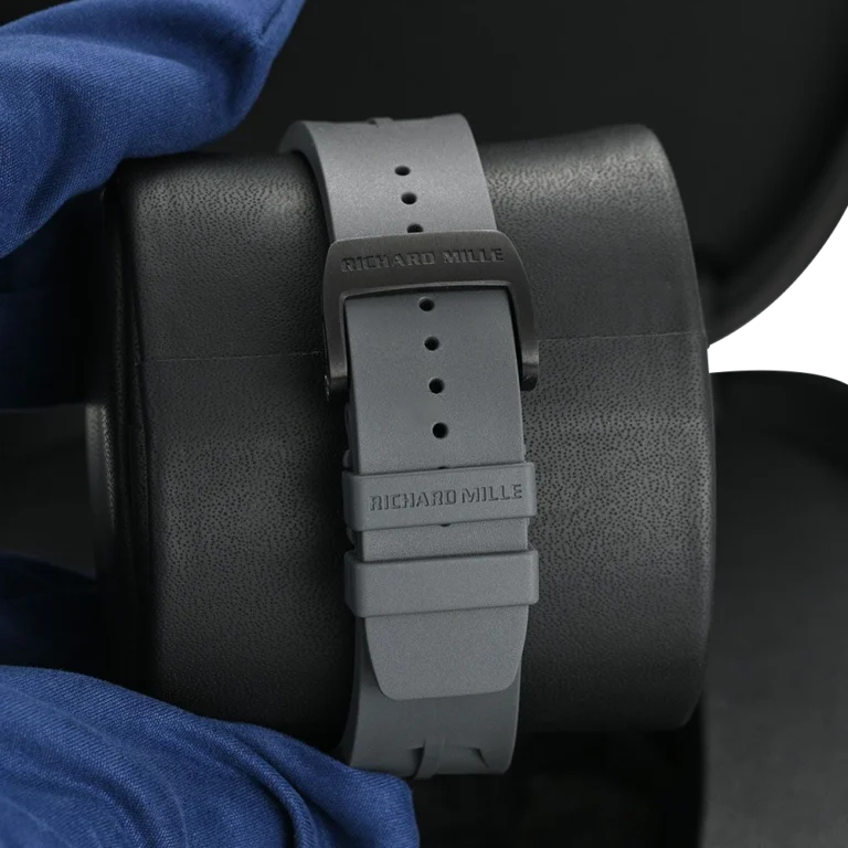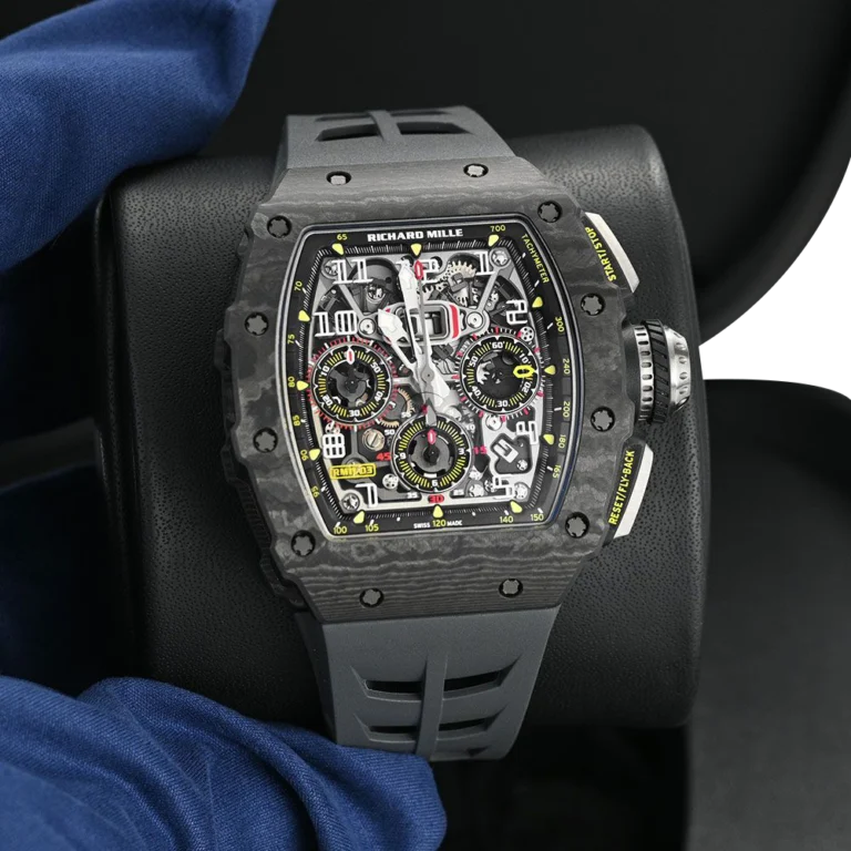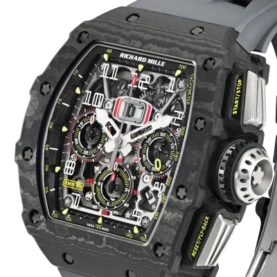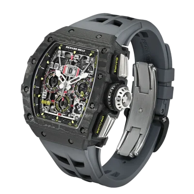 The Richard Mille RM 11-03 in carbon fiber and titanium is a bold fusion of motorsport-inspired engineering and modern materials. Its 50mm case features an ultra-lightweight, high-resistance carbon TPT shell combined with a titanium core, resulting in exceptional durability without sacrificing comfort. The skeleton dial reveals the complex flyback chronograph movement beneath, showcasing Richard Milles obsession with mechanical innovation and aesthetic depth. Designed for high performance, the RM 11-03 includes a flyback chronograph, annual calendar, and 60-minute countdown timer, making it a powerhouse of functionality. With its striking layered carbon textures, futuristic form, and cutting-edge precision, this timepiece is a statement of advanced horology and fearless design.