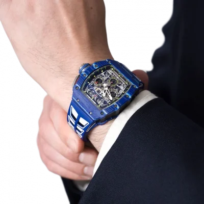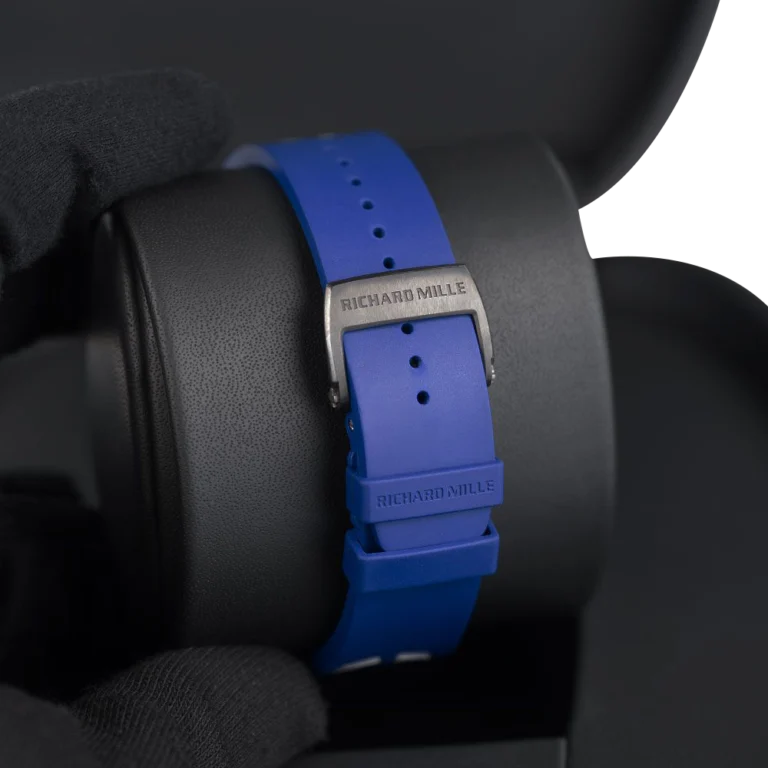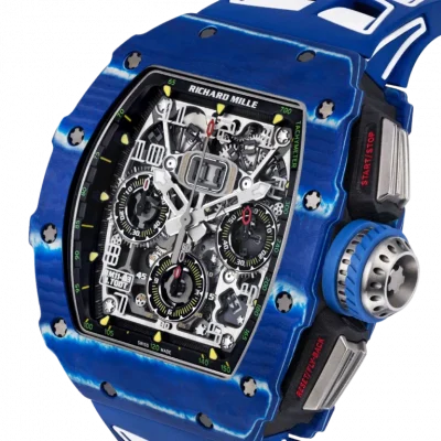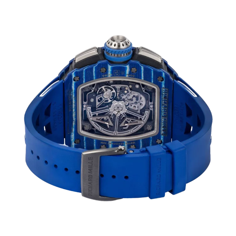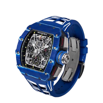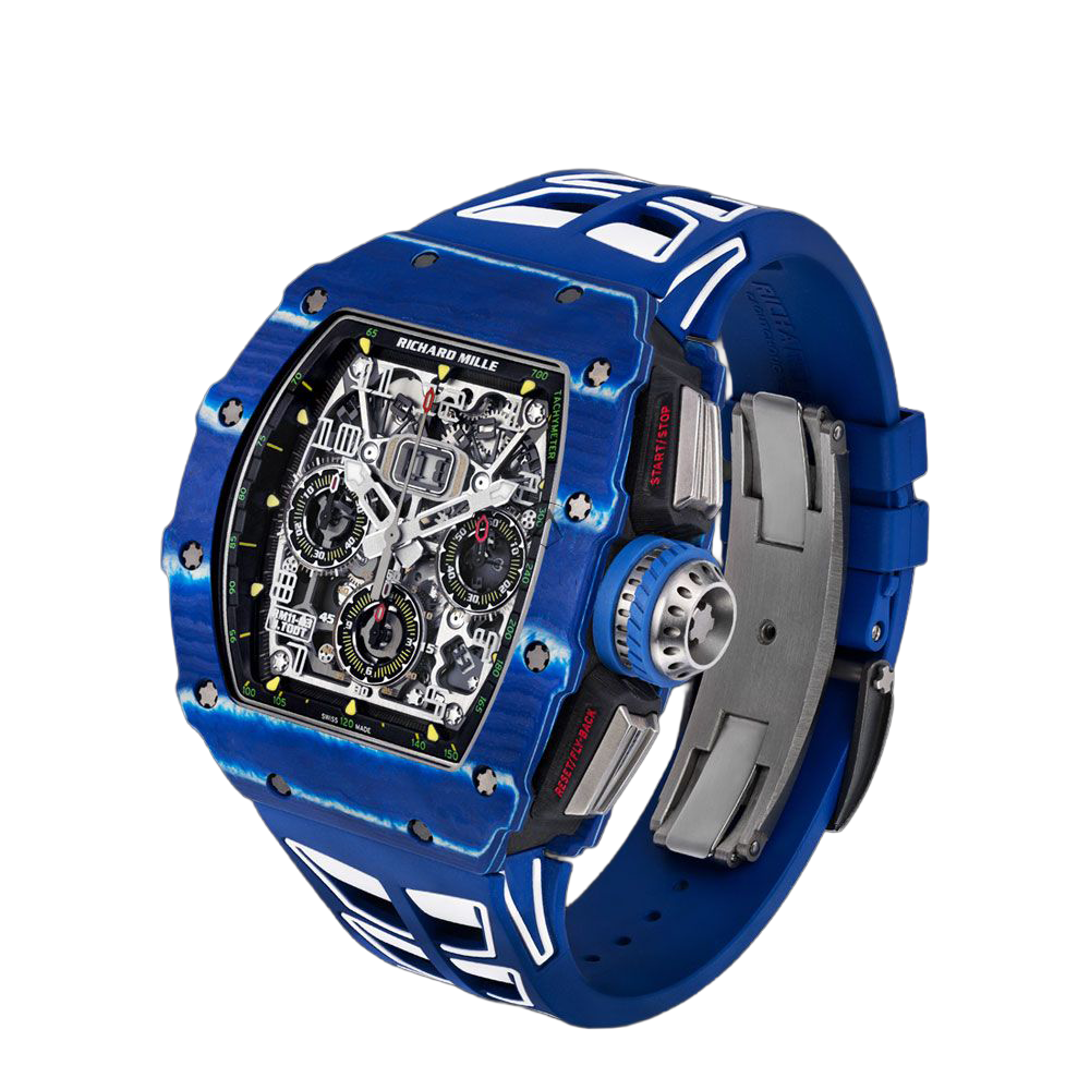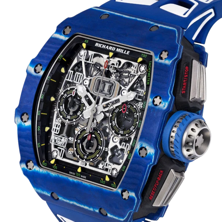 Richard Mille designed the RM 11-03 watch in honor of his close friend, Jean Todt, who is the president of the Federation Internationale de l’Automobile. This watch has a stunning design with a tounneau-shaped case made of NTPT Blue Carbon and NTPT Black Carbon. Its size is 44.50 x 49.94 mm. The movement of this watch is skeletonized and is more durable than ever before due to the alloy that composes of 90% grade 5 titanium, 6% aluminium, and 4% vanadium. The RMAC3 Calibre powers the watch with automatic winding movement, adjustable rotor geometry, and a 50-hour power reserve. The watch has features such as hours, minutes, seconds, flyback chronograph, 60-minute countdown timer functionality, and an oversized date display. The watch comes with a rubber bracelet that has a fold-over titanium clasp. The RM 11-03 watch is water-resistant up to 50 meters (164 feet).