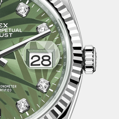 - Dial color: Olive green dial with palm motif and 10 Diamonds as hour markers framed in 18k White Gold