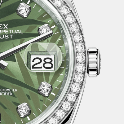 - Dial color: Olive green dial palm motif and 10 Diamonds as hour markers framed in 18k White Gold