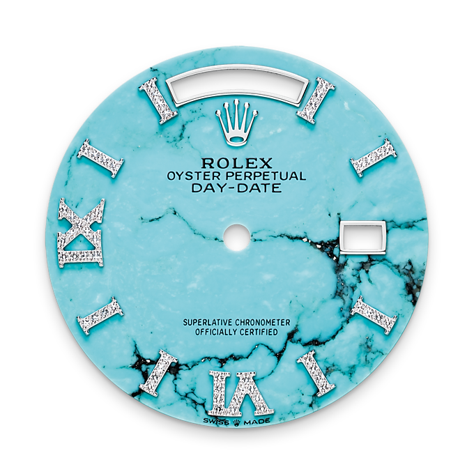 Unworn watch Rolex Day-Date 36, 18k White Gold, 36mm, Ref# 128239-0045. New for 2023 in the Oyster Perpetual Day-Date 36, series are watches with dials made of decorative stones. Thanks to the unique crystallized effects, matrices and veins of aventurine, carnelian and turquoise, and their skillful processing, each dial turns into a unique work of art, being a worthy addition to the rest of the flawless Day-Date details. As always elegant and luxurious Day-Date 36 – is an excellent choice for people who appreciate unique beauty, high style and absolute comfort. The turquoise dial will not leave indifferent any connoisseur of beauty and sophistication. Its index hour markers and Roman numerals VI and IX in 18k White Gold are respectively set with 32 and 24 diamonds, , using a flawless setting and leveling technique that highlights the stones’ subtle brilliance. The classic polished hands made of 18k White Gold look amazing on such a dial, emphasizing the sophistication of the model. The date indicator is traditionally placed at the 3 o’clock position. At the 12 o’clock, position is a semi-circular window showing the day of the week in full, providing an instantly recognizable, unique design of Day-Date. The ribbed screw-down crown in 18k White Gold Triplock with double watertight system, adorned with the Rolex logo, is a traditionally recognizable part of Rolex watches. The dial is covered with a scratch-resistant anti-reflective sapphire crystal and a Cyclops lens above the date with double anti-reflective coating. A solid 18k White Gold screw-down case back with fine fluted edges, closes the movement. The fluted fixed 18k White Gold bezel is not only an aesthetic element of this watch, but also a true hallmark of Rolex. The in-house Rolex mechanical movement, caliber 3255, contains 31 jewels and has an approximate power reserve of approximately 70 hours powers. This delightful timepiece is presented on an 18k White Gold Diamond-set President bracelet with semi-circular 3-piece links for flawless beauty. It features Rolex’s original concealed folding Crownclasp to secure the watch on your wrist. Water resistant up to 100m/330ft (10 ATM).