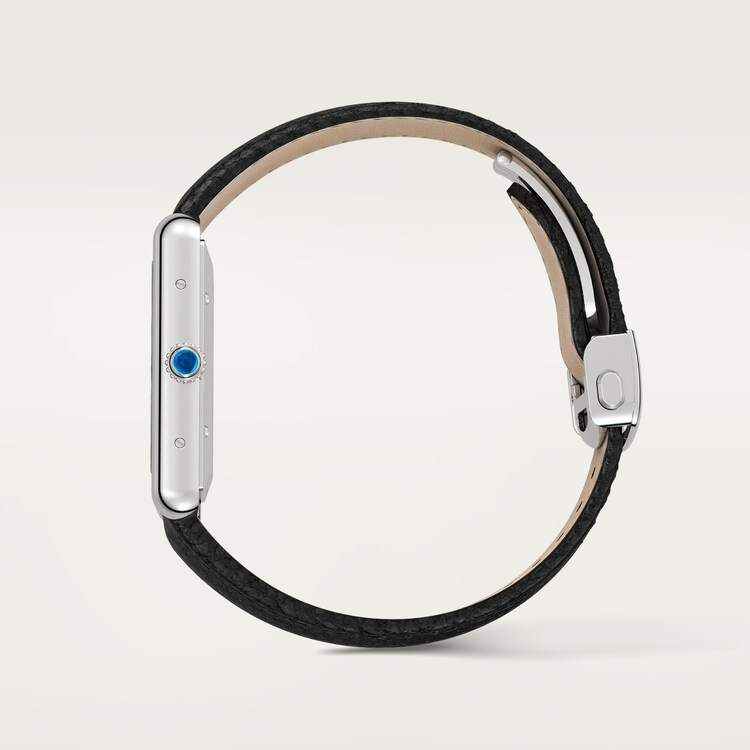 Introducing unworn the Cartier Tank Must de Cartier watch, reference WSTA0040, is a refined expression of the brand’s iconic Tank design, blending historical elegance with modern craftsmanship. This extra-large model features a 41mm x 31mm Stainless Steel case with a thickness of 8.4mm, offering a substantial yet comfortable presence on the wrist. The watch features a sophisticated silver dial that catches the light with understated sophistication. The flat perimeter provides a clean, modern frame with large black Roman numerals serving as hour markers. The center of the dial features a flinqué texture, an intricate detail that adds depth and elegance. A minute track, reminiscent of a train track, runs along the border, enhancing functionality. The harmonious contrast between smooth and textured surfaces enhances the visual appeal of the dial, making it both timeless and distinctive. The blued steel sword-shaped hands and date aperture at 6 o’clock are protected by scratch-resistant sapphire crystal. Powered by Cartier’s in-house caliber 1847MC automatic movement, beating at 28,800 vph with 23 jewels and offering a 42-hour power reserve, powers this model. The beaded crown is adorned with a blue synthetic cabochon-shaped spinel, adding a touch of sophistication. Completing the timepiece is a black grained calfskin strap with an interchangeable steel deployant buckle, allowing for versatility and ease of wear. Having water-resistant up to 3 bar (approximately 30 meters/100 feet), the Tank Must WSTA0040 combines timeless design with practical functionality, making it a distinguished choice for those seeking a classic yet contemporary wristwatch.