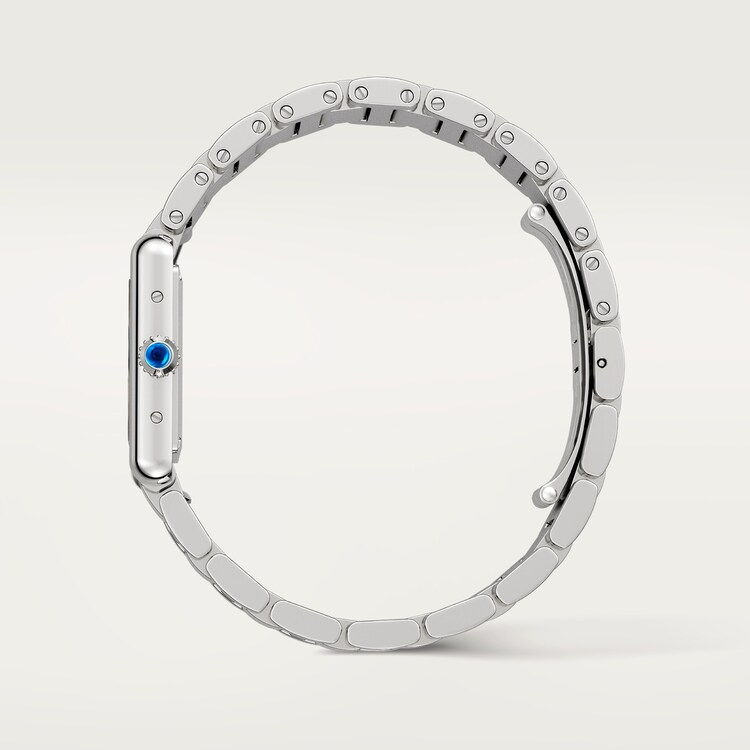 Introducing unworn Small watch, the Cartier Tank Must de Cartier Ref# WSTA0107 embodies the brand’s commitment to timeless elegance and minimalist design. Drawing inspiration from the original Tank watch introduced in 1917, this model maintains the iconic rectangular silhouette and clean lines that have become synonymous with Cartier’s watchmaking heritage. Constructed from polished stainless steel, the case measures 29.5mm x 22mm with a thickness of 6.6 mm, offering a balanced presence on the wrist. This model is part of Cartier’s Tank Must collection, which reimagines the classic Tank design with modern updates while maintaining its iconic features. The Silvered dial with Black printed Roman numeral hour markers complemented by blued-steel sword-shaped hands. In the center is a finely printed black minute/seconds scale with bright markers every five minutes, adding charm and practical functionality. A beaded crown set with a blue synthetic cabochon-shaped spinel adds a touch of sophistication, a signature detail in Cartier’s design language. Powered by a high-autonomy quartz movement, the watch offers reliable timekeeping with minimal maintenance. The watch is paired with an interchangeable brushed and polished Stainless Steel bracelet, secured by a Stainless Steel Deployant Clasp, ensuring both comfort and style. Finished with a scratch-resistant sapphire crystal, solid case back, and rated water-resistant up to 30 meters (100 feet), the Santos WSTA0107 is a sophisticated companion built for both everyday wear and formal occasions.